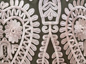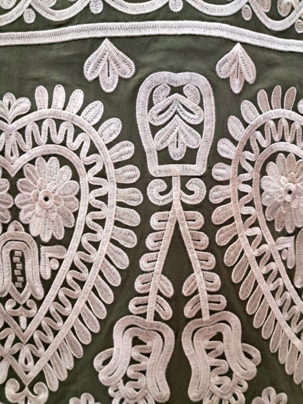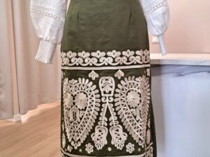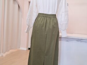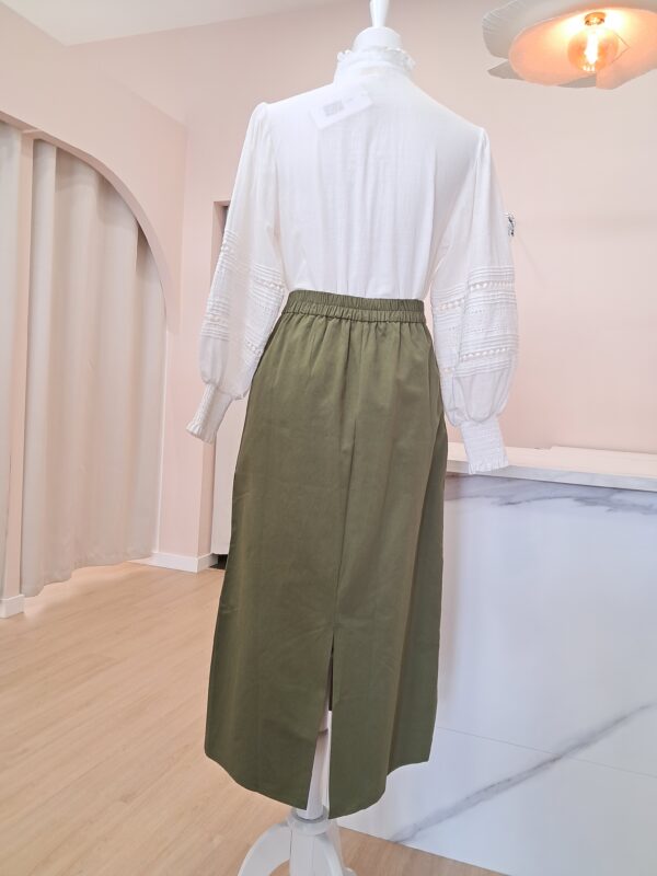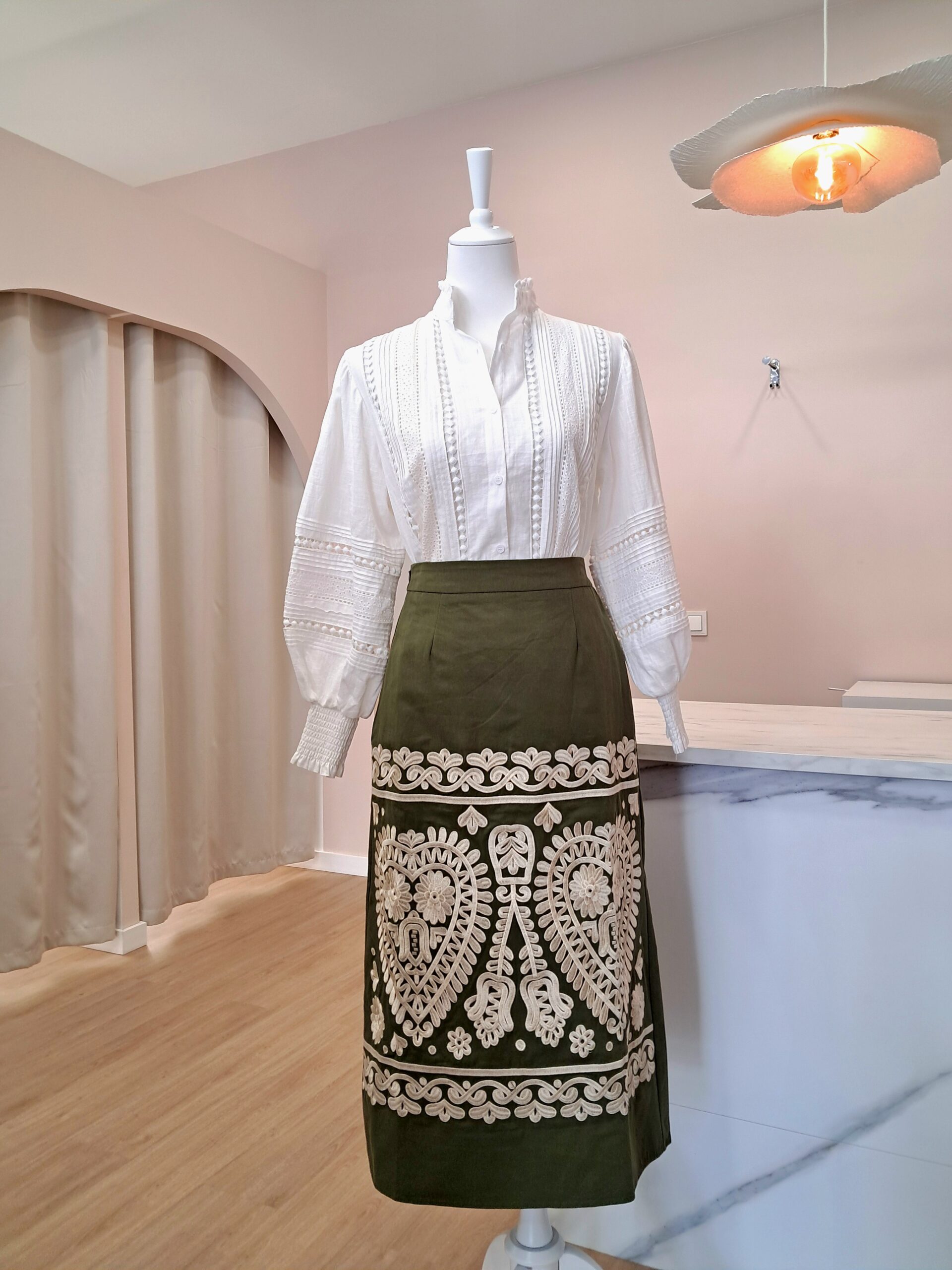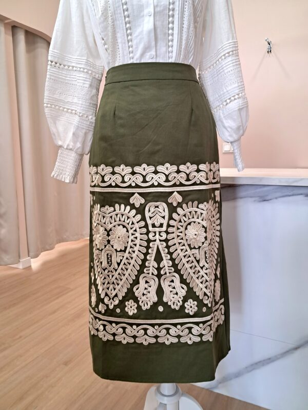 Falda midi, apertura trasera, cremallera lateral, cintura elastica, forro, color verde botella, bordado beige
