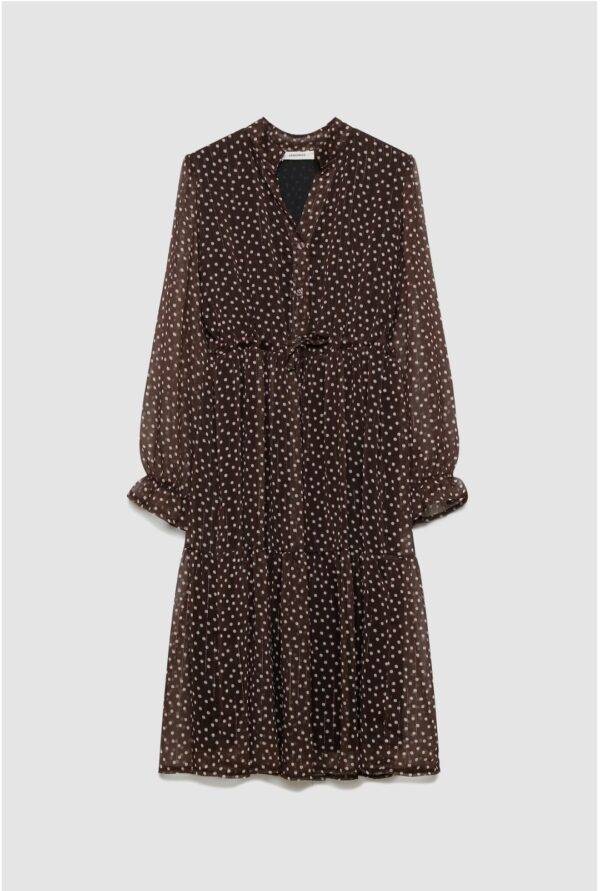 Tejido fluido. Estampado. Cuello redondo y escote pico. Manga larga. Cintura ajustable con cordones. Diseño midi.